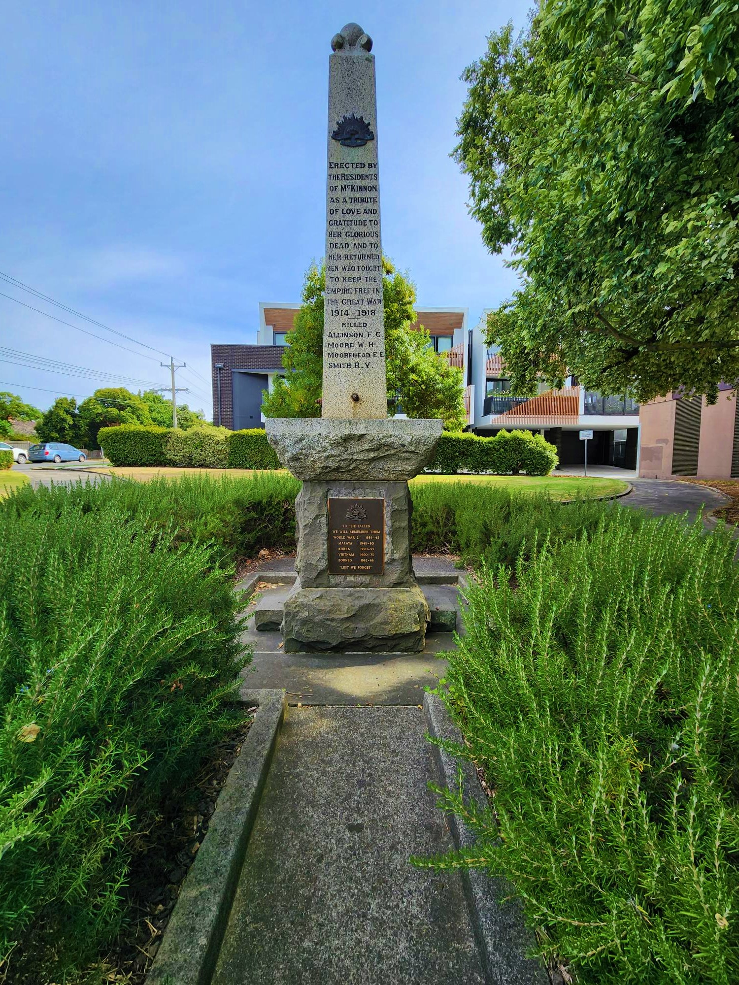 Located on the corner of Wattle Grove and McKinnon Road, McKinnon Memorial Garden is the perfect spot to sit, relax and reflect. The large granite obelisk located at McKinnon Memorial Gardens is dedicated to Glen Eira residents who served in the First World War.