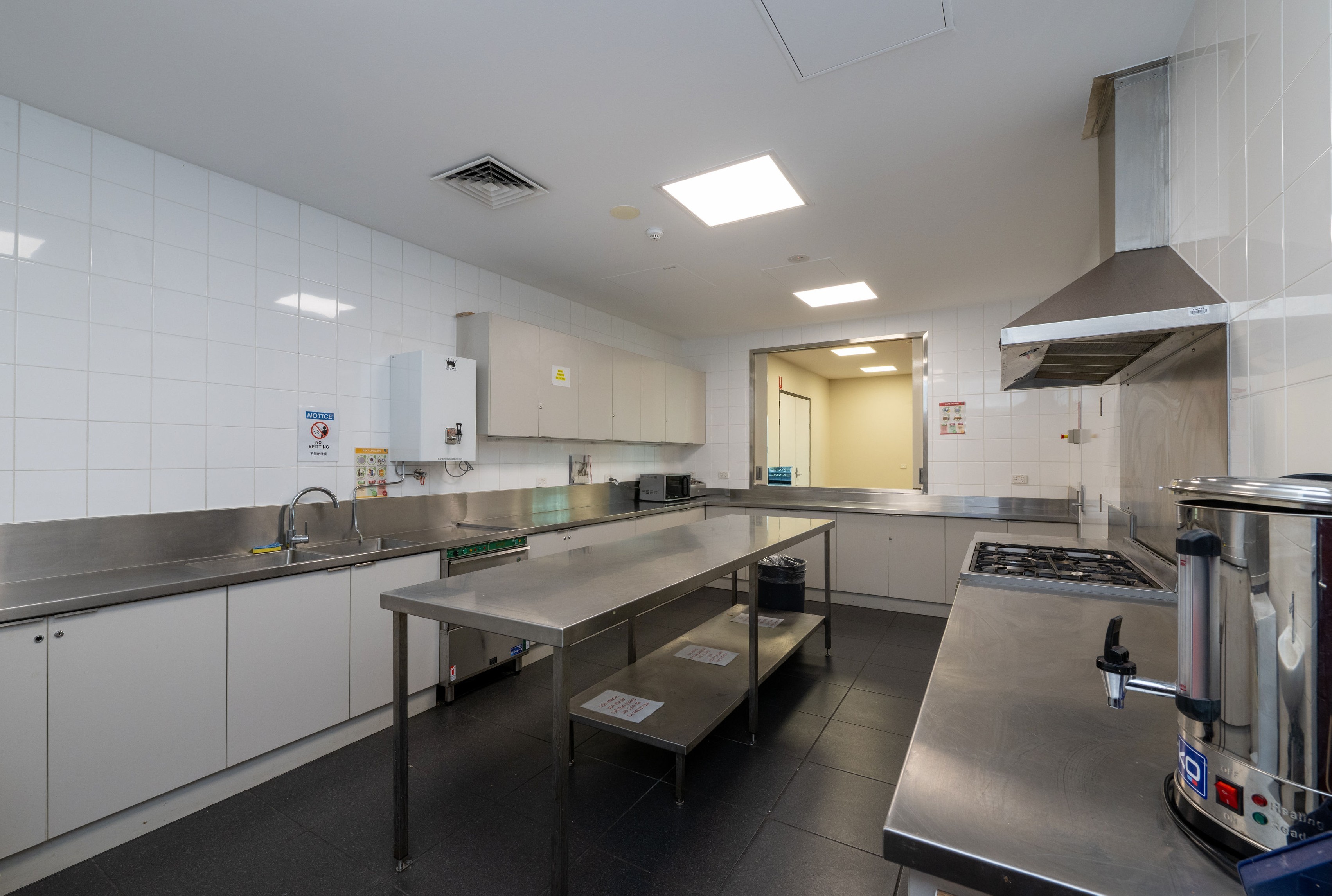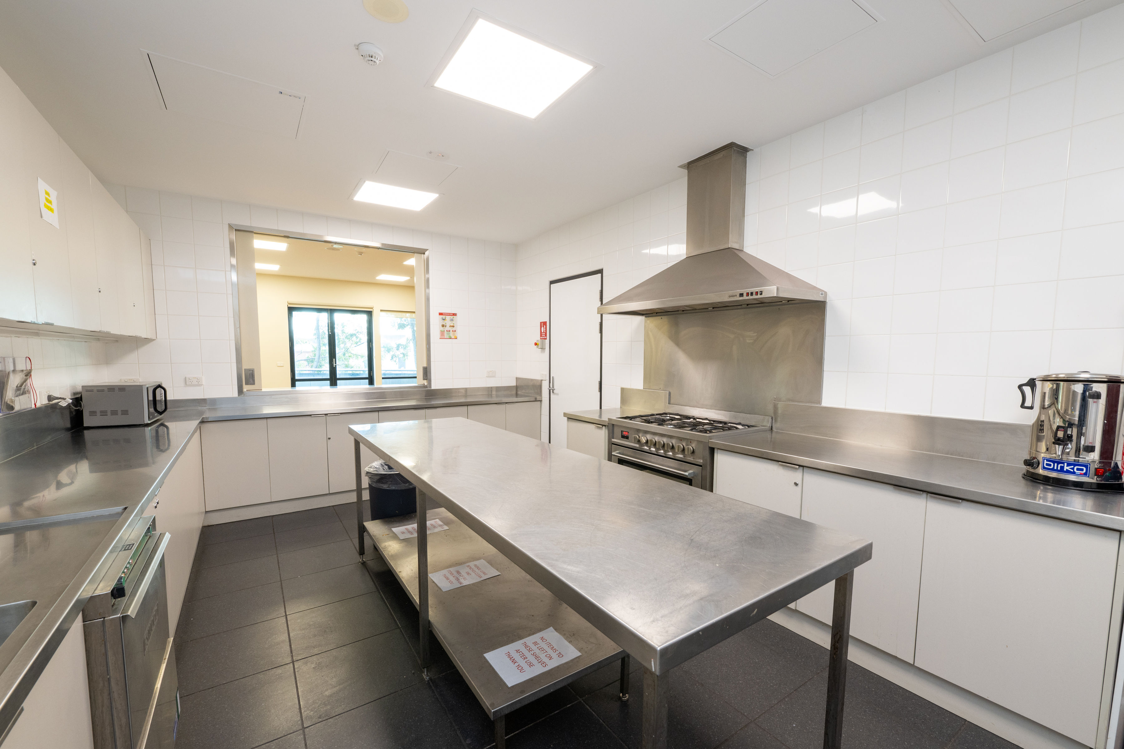 - Kitchen facilities include a commercial cooktop, oven, microwave, hot-water urn, fridge and freezer